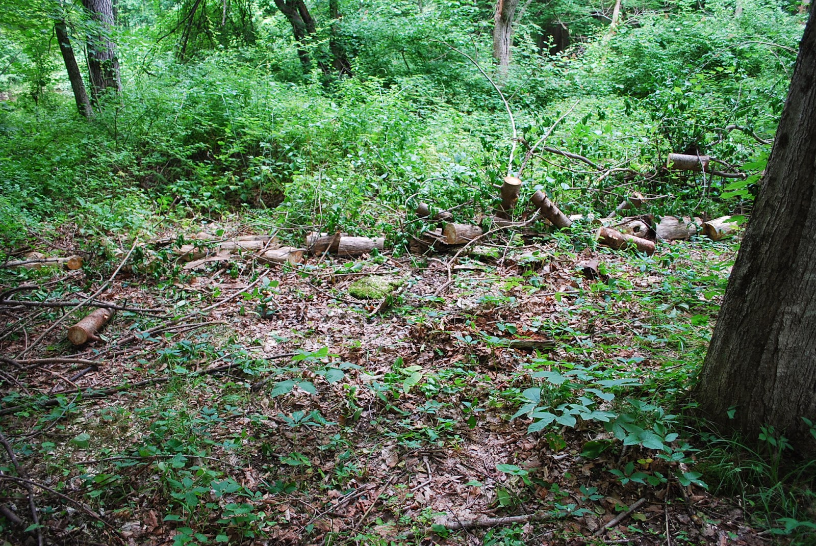 Serious clearing behind the back yard. Note the huge vine on the tree to the right; that's Japanese bittersweet, the scourge of the forest.