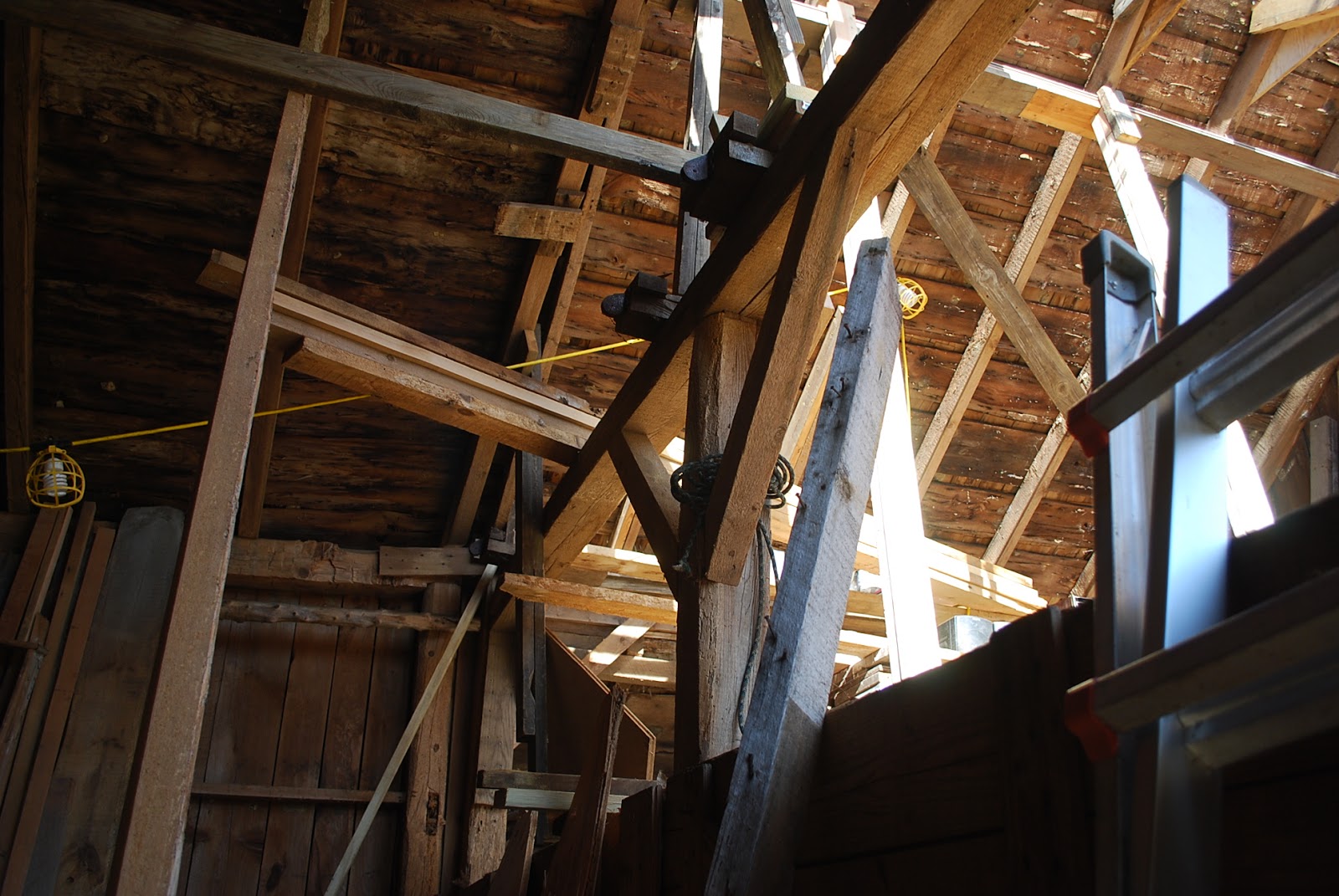 Eighteen foot oversized hemlock timbers shoring the rafters opposite the side that might move in a heavy snow. Only three, but that's the part that might move catastrophically.