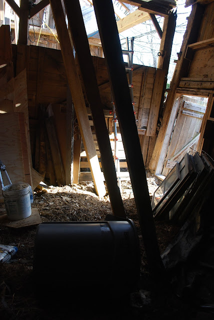 I had been redoing what was already redone last year on the barn; my shoring and jacking all went splayed again because I didn't finish properly securing the corners and rafter ties before the snow dumped on us.